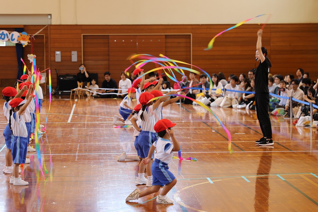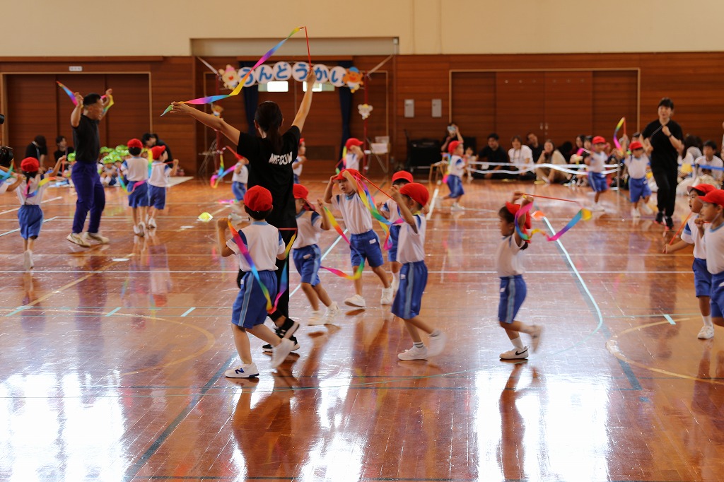 嵐の「Happiness」に合わせてリボン体操をしました。指先がしっかりと伸びていましたね。