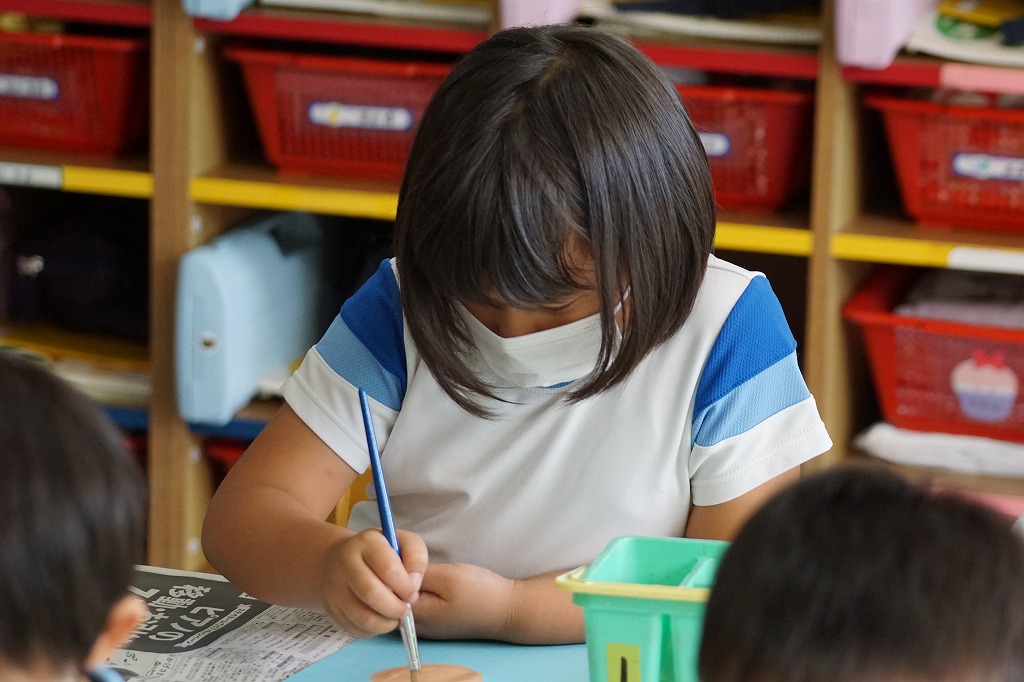 10月は落ち着いて園生活が送ることができる時期です。初旬に実施した運動会の絵を描いています。絵具やクレヨン等の使い方も、大切な経験です。