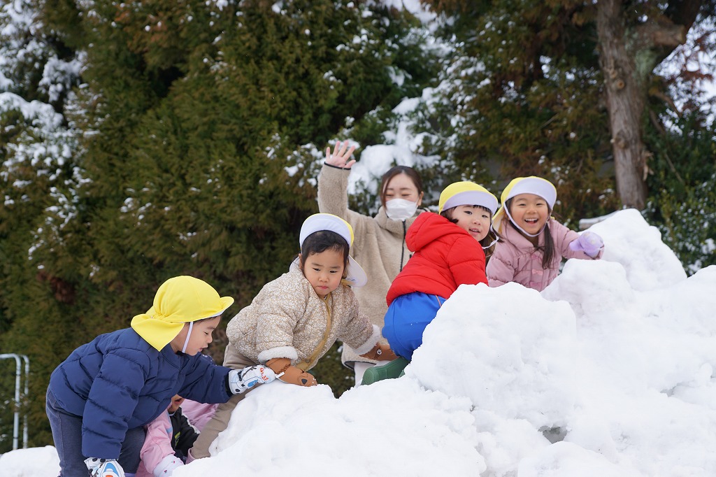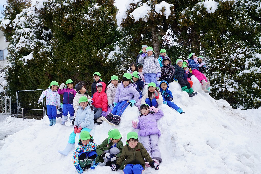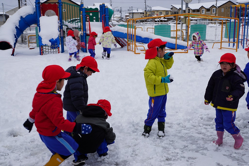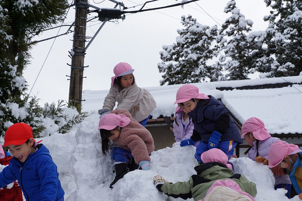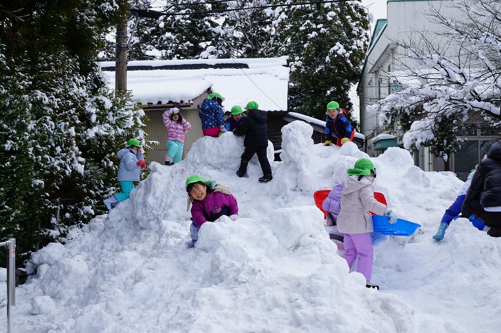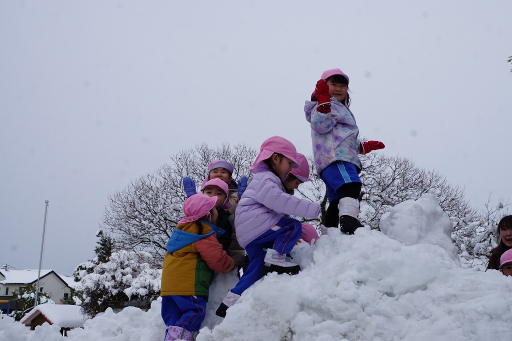 グランドに大きな雪山が出来ました。雪の晴れ間に雪遊びをしました。