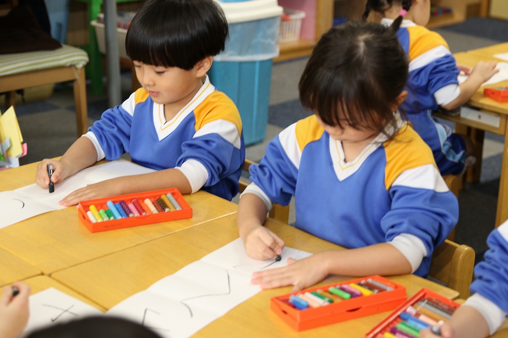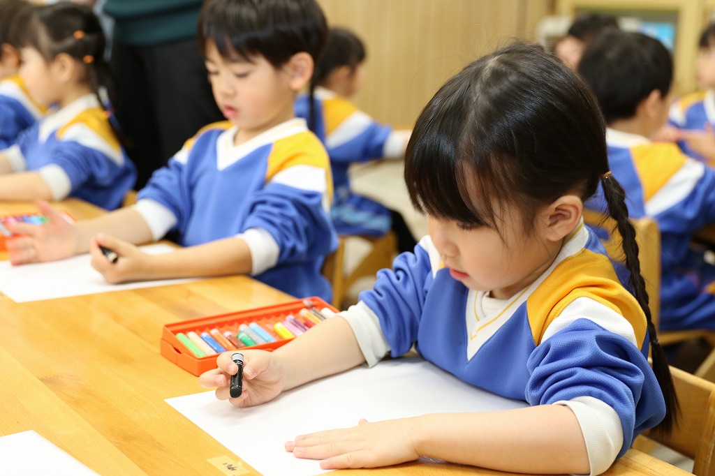 年長組、卒園アルバムの表紙絵を描いています。